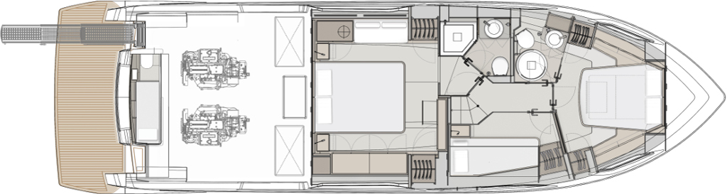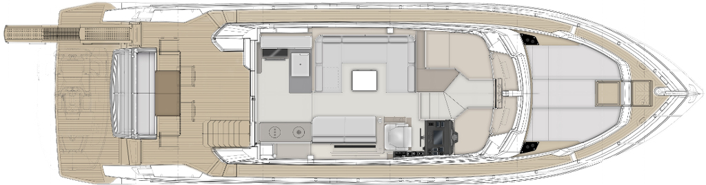 El flybridge panorámico permite gobernar el barco con excelente visibilidad y dispone de amplias zonas de solárium. En popa, el cockpit ofrece un espacio cómodo para comidas al aire libre, mientras que la plataforma de baño facilita el acceso al agua.